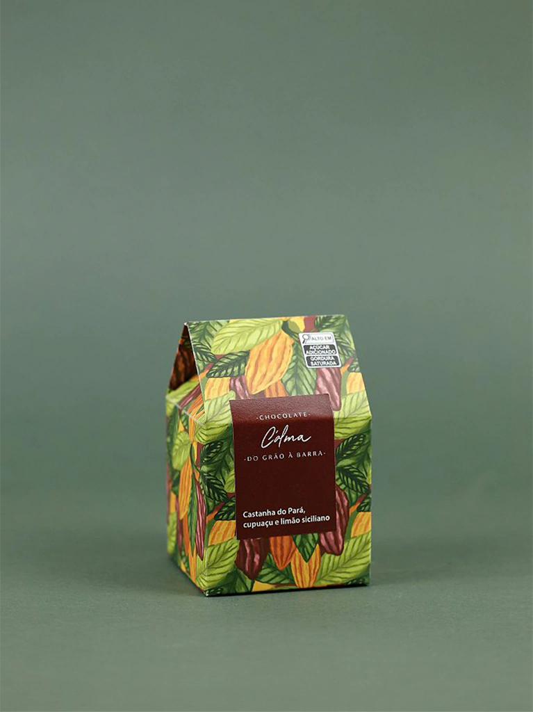 Caixinha com lascas de chocolate ao leite recheadas de duja de castanha-do-Pará, com o toque doce e exótico do cupuaçu cristalizado e a leve acidez aromática do limão siciliano.